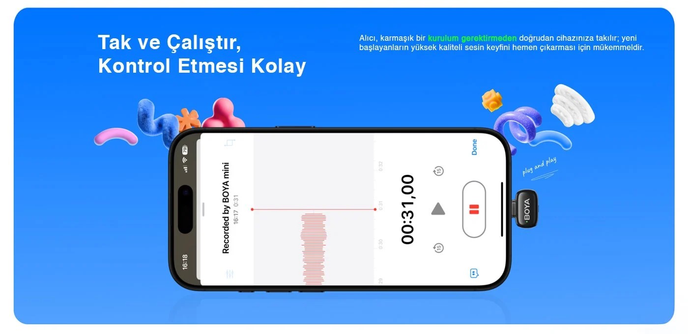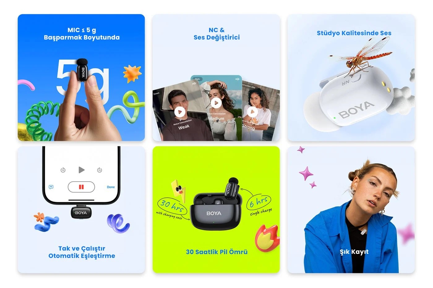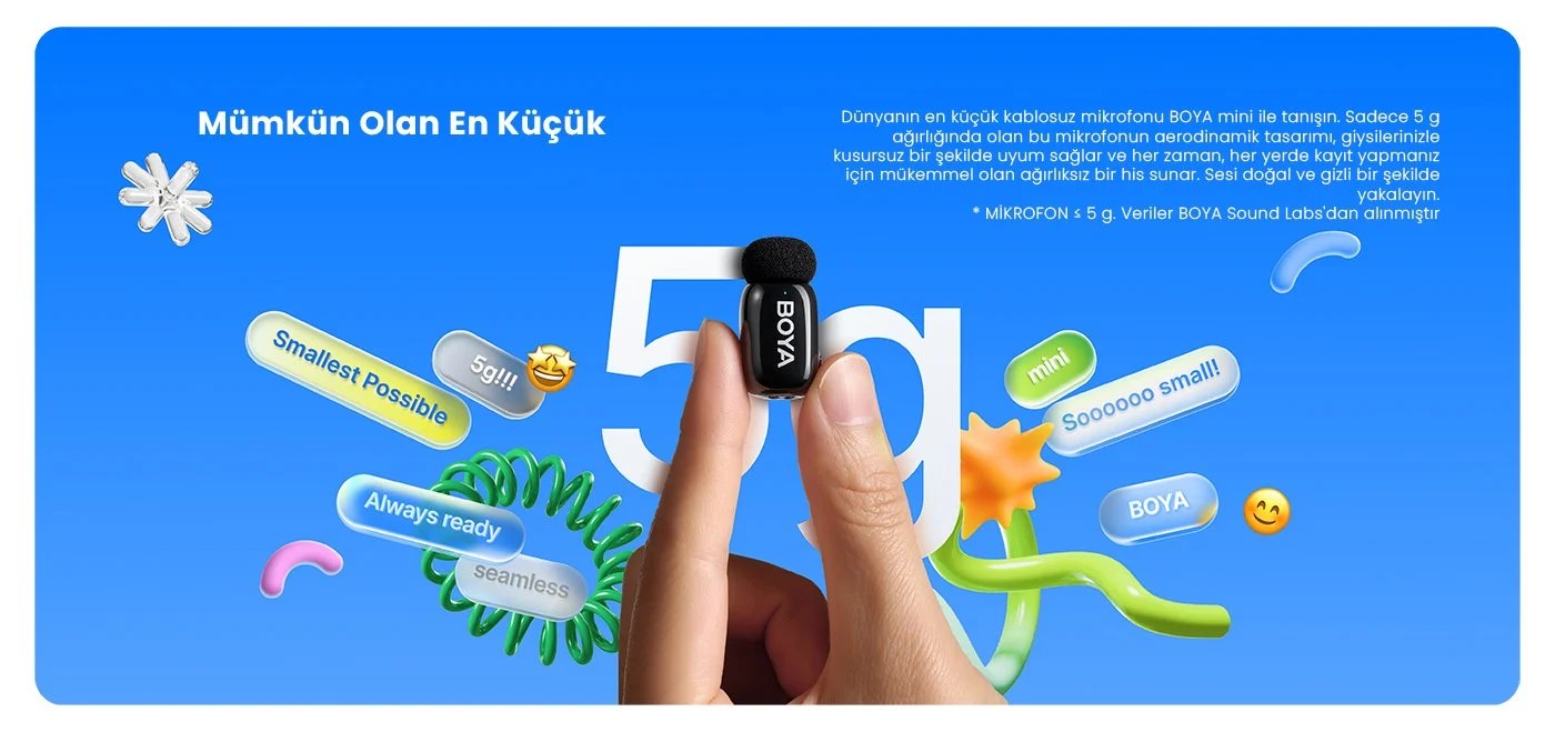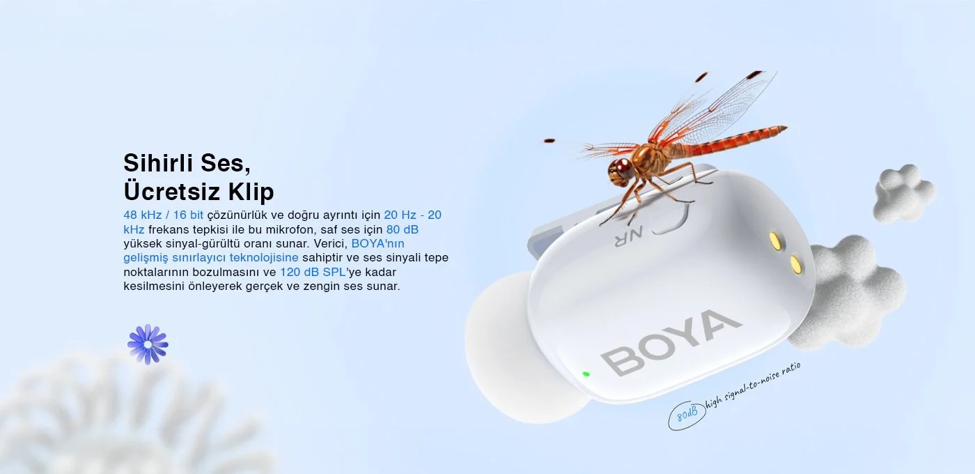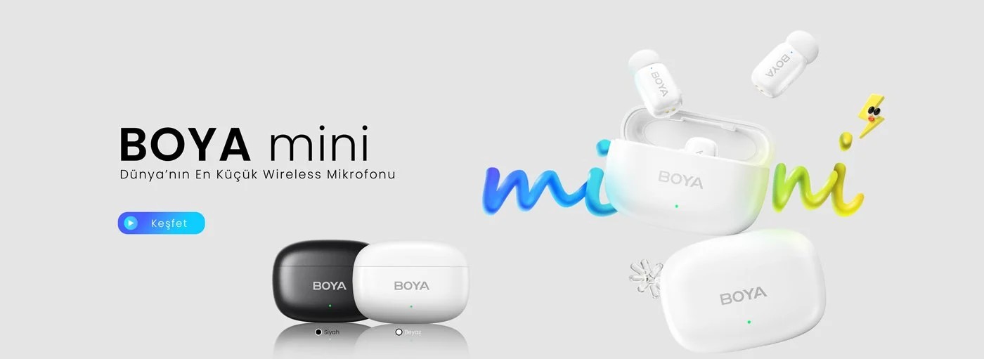 BOYA Mini Wireless Yaka Mikrofonu - Boyamini, içerik üretimi, canlı yayın, vlog ve röportaj çekimleri için tasarlanmış ultra kompakt ve profesyonel ses çözümüdür. Akıllı telefonunuz veya kamera sisteminizle uyumlu çalışır. Kablosuz iletişim, düşük gecikme süresi ve yüksek kaliteli ses ile üstün performans sunar.