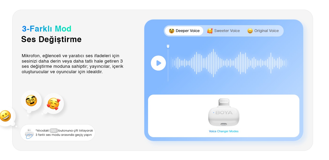 - Ses Değiştirme Modları: 3 mod (daha derin ses, daha tatlı ses, orijinal ses)